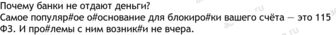 банк 18, банка 12, деньга 12, счет 11, вклад 8, блокировка 7, 115 6, закон 6, фз 6, документ 5, месяц 5, шаг 5, вкладчик 4, жалоба 4, запросить 4, их 4, отдавать 4, отделение 4, отказ 4, подать 4