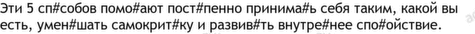 себе 5, помогать 4, принимать 4, внутренний 3, много 3, радость 3, эмоция 3, 5 2, деть 2, маленькая 2, поддерживать 2, признавать 2, самокритика 2, создавать 2, сравнивать 2, уменьшать 2, успех 2, ценить 2, чувство 2, 1 1
