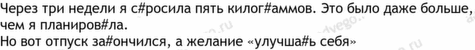 много 5, все 4, бояться 3, вес 3, зеркало 3, килограмм 3, постоянный 3, еда 2, иза 2, минус 2, мыть 2, начаться 2, неделя 2, пот 2, салат 2, сахар 2, сбросить 2, съесть 2, тело 2, утром 2