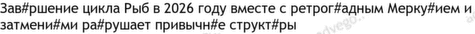 Статья представляет гороскоп на самый мистический период 2026 года - сезон Рыб. Узнайте, как ретроградный Меркурий, затмения и соединение Сатурна с Нептуном заставляют нас отпустить контроль, довериться хаосу и найти истинные опоры внутри себя. Прогноз для всех знаков зодиака.