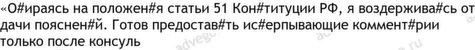 1. Статья 51 Конституции РФ: отказ от дачи показаний без адвоката по соглашению для предотвращения самооговора.