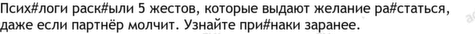 Статья о 5 жестах, выдающих желание расстаться. На основе психологических исследований языка тела. Практичная и полезная. Высокий спрос на форумах отношений.
