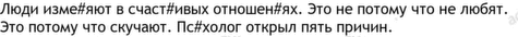 измена 6, причина 6, отношение 5, страсть 5, счастие 5, брак 4, изменять 4, искать 4, счастливый 4, максим 3, новизна 3, адреналин 2, желаемый 2, интересный 2, ирина 2, неизвестность 2, нравиться 2, один 2, предсказуемость 2, против 2