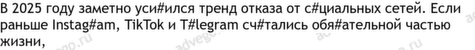 соцсеть 7, цифровой 5, 2025 4, все 4, удалять 4, instagram 3, tiktok 3, доход 3, закрытый 3, много 3, отказ 3, постоянный 3, усталость 3, telegram 2, активный 2, блогинг 2, детокс 2, желание 2, здоровье 2, интерес 2