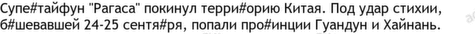 24 сентября 2025 года на южное побережье Китая обрушился сильный тайфун «Рагаса». Он принес с собой ураганные ветры, проливные дожди и угрозу катастрофических наводнений. Власти предприняли всевозможные меры по подготовке к удару стихии. Текст статьи от 3-го лица, разбит на логичные абзацы, легко читается.