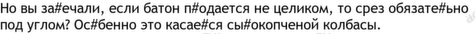 колбаса 8, резать 4, угол 4, кусок 3, объяснение 3, срез 3, иза 2, колбасный 2, ломтик 2, получаться 2, продукт 2, сырокопченый 2, батон 1, больший 1, бутерброд 1, вареный 1, варить-копченый 1, визуальный 1, вилять 1, впечатление 1