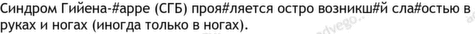 Синдром Гийена–Барре (СГБ) — редкое, но опасное иммунное заболевание нервной системы, проявляющееся быстро нарастающей слабостью в конечностях, иногда приводящей к параличу и дыхательной недостаточности. Часто развивается через 2–3 недели после инфекции (особенно кишечной или COVID-19). Болезнь может сопровождаться болями, нарушением чувствительности, сердечного ритма и давления, но без лихорадки.