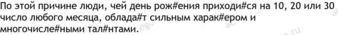 В статье рассказывается, почему нумерологи выделяют людей, которые появились на свет 10, 20 и 30 числа любого месяца. Считается, что они обладают особыми талантами и сильным характером. Повествование ведётся от 3 лица.