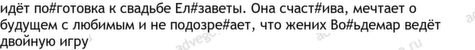 вольдемар 7, елизавета 7, оно 7, семья 5, деньга 4, родитель 3, средство 3, счастливый 3, бизнес 2, жених 2, марина 2, миллион 2, план 2, рубль 2, свадьба 2, счет 2, 10 1, 105 1, 12 1, 4 1