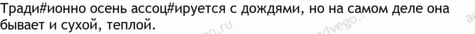 лето 12, осень 8, оно 4, все 3, смена 3, хотеться 3, ассоциироваться 2, дождь 2, легкий 2, нужно 2, спешить 2, стоить 2, бежать 1, беззаботность 1, беспокойный 1, борщевик 1, бывать 1, весна 1, вечный 1, взрослый 1