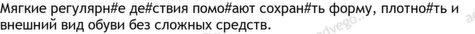 обувь 9, помогать 8, уход 8, материал 5, мягкий 5, сохранить 5, влага 4, очистка 4, поэтому 4, сушка 4, трение 4, хранение 4, блеск 3, естественный 3, поверхность 3, регулярный 3, температура 3, аккуратный 2, быстрый 2, влажность 2