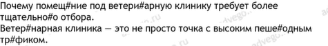 помещение 28, клиника 26, ветеринарный 18, вентиляция 17, зона 15, кабинет 14, отдельный 12, формат 12, вход 11, жилой 11, возможность 10, объект 10, требование 10, частый 8, канализация 7, м 7, мощность 7, персонал 7, площадь 7, этаж 7