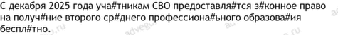 Бесплатный 4, бюджет 3, ВБД 2, вне конкурса 2, выплата 7, государство 2, документ 8, единовременный 4, ежемесячный 3, жилищный 4, компенсация 3, льгота 8, Минобороны 3, налог 4, образование 2, поддержка 6, право 8, реабилитация 2, региональный 3, СВО 22, социальный 3, спецоперация 7, справка 7, статус участника СВО 8, удостоверение 5, участие в СВО 4, участник СВО 13, федеральный 6