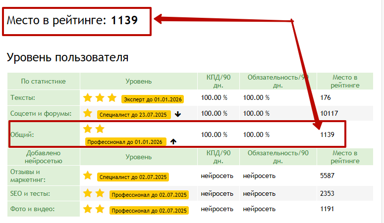 Уровень исполнителя определяет доступность заказов с быстрым поиском для этого уровня, например, заказ для ТОП-500 (Экспертов) пользователи с рейтингом 501 и ниже не смогут взять в работу, но смогут подать заявку.